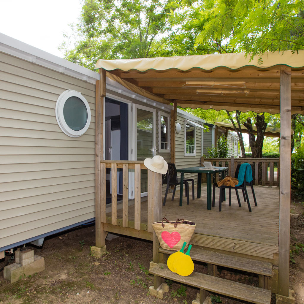 Air-conditioned mobile home for 4 to 6 people with 3 separate bedrooms, terrace, TV, fitted kitchen, bathroom and separate WC. Total surface area with terrace 44 m2.